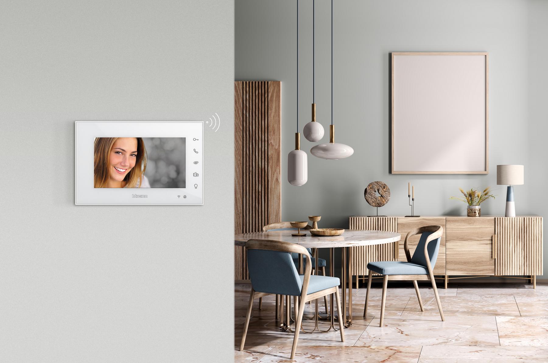 7"video telefon s WI-FI v bílé barvě, napájení ze zásuvky 230 V pomocí adaptéru (napájí video telefon i vstupní panel), lze nahradit zdrojem do rozváděče.