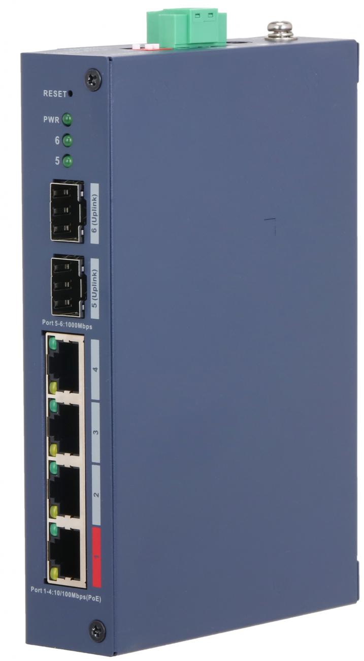 Průmyslový PoE switch, široký teplotní rozsah -30 až 65 °C, management L2, 4 x PoE 10/100 Mbps, 2 x Gb SFP uplink, celkový budget je 90 W, IEEE 802.3af; IEEE 802.3at; Hi-PoE; IEEE 802.3bt. Přepěťové ochrany, kov, police nebo DIN,...