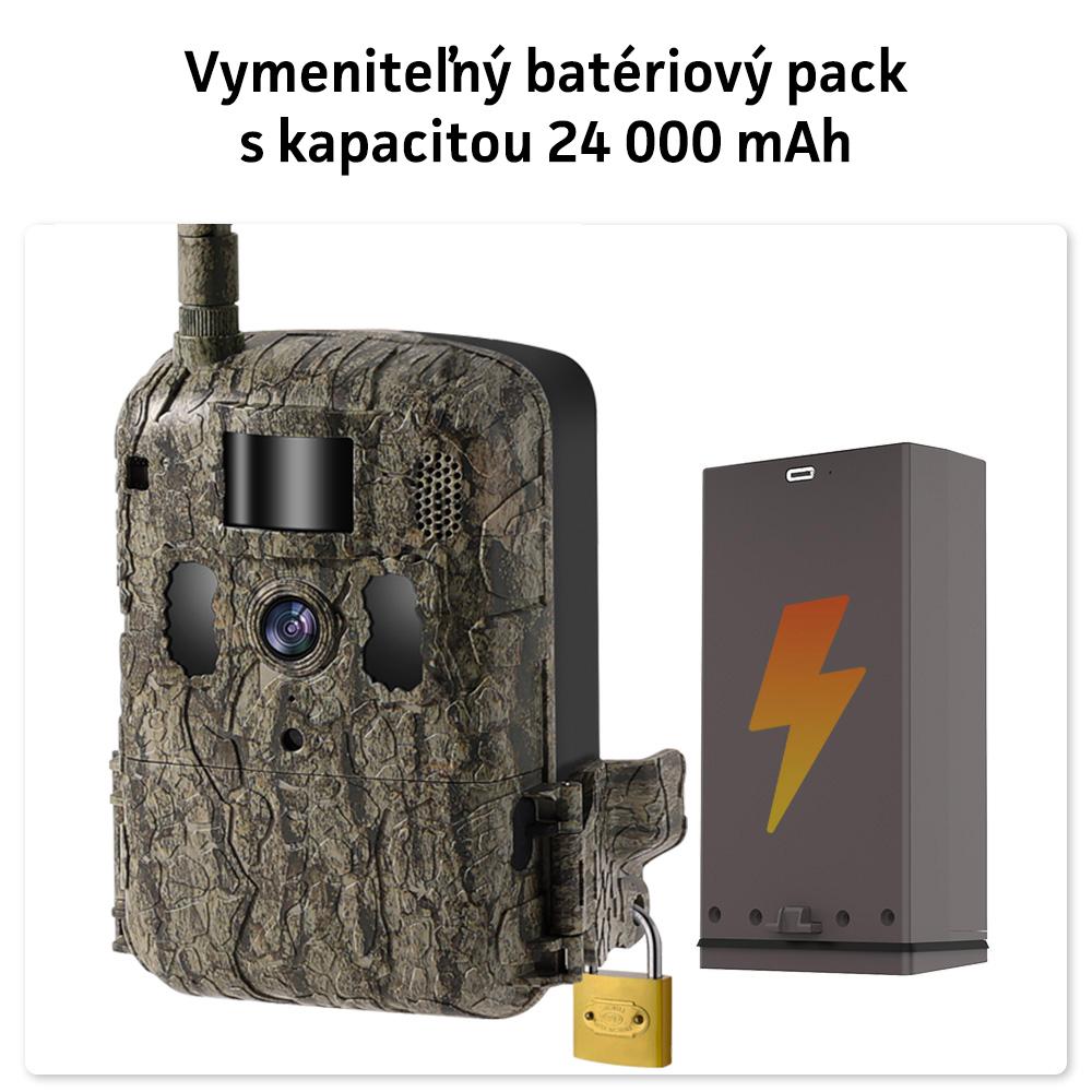 - Vymeniteľný batériový pack s kapacitou 24 000 mAh. Výdrž až 180 dní + automatické prepnutie napájania cez solárne panely (v balení) - takže sa fotopasca nikdy nevybije.