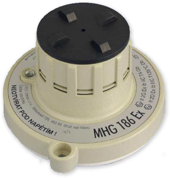 Hlásič kouře ionizační interaktivní MHG 186 Ex je samočinný hlásič sloužící k signalizaci vznikajícího požáru jako detektor kouře na principu ionizace vzduchu a jeho příměsí v ionizační komoře. Hlásič je určen do prostředí s nebezpečím výbuchu. Používá se v analogovém adresovatelném systému elektrické požární signalizace LITES. Hlásič reaguje na zplodiny hoření – viditelné i neviditelné částice kouře (aerosoly) na principu ionizace vzduchu a jeho příměsí v ionizační komoře. Hlásič kouře ionizační MHG 186 Ex je určen pro vnitřní prostory objektů a všude tam, kde vyhovuje svým krytím a klimatickou odolností a kde nedochází k náhlým teplotním změnámvedoucím k orosování a námrazám. Hlásič splňuje požadavky ČSN EN 54-7. Hlásič je určen do prostředí s nebezpečím výbuchu. Umisťuje se v místech předpokládaného výskytu a soustředění kouře v objektech s materiály, které při doutnání nebo hoření vyvíjejí kouř. Hlásiče MHG 186 Ex se připojují k adresovatelným ústřednám LITES MHU 115, MHU 116 a MHU 117 pomocí oddělovací jednotky MHY 946. Oddělovací jednotka se umisťuje v prostředíbez nebezpečí výbuchu, je zapojena do adresovatelné linky ústředny a je napájena z ústředny nebo z pomocného zálohovaného zdroje. Na jiskrově bezpečný výstup oddělovací jednotky jsou zapojeny jiskrově bezpečné hlásiče pomocí svorkovnic MHY 741. Hlásič MHG 186 Ex je certifikován výhradně se svorkovnicí MHY 741, dodávanou samostatně. K hlásiči MHG 186 Ex nelze připojit žádné signální svítidlo. Použití hlásičů podléhá schválení FTZÚ v Ostravě - Radvanicích NB 1026, číslo certifikátu je FTZÚ 19 ATEX 0097X. Hlásič MHG 186 Ex představuje nevýbušné elektrické zařízení: Druh ochrany proti výbuchu plynu je jiskrovou bezpečností "ib" podle ČSN EN 60079-11. Hlásič má vysokou úroveň ochrany pro výbušnou plynou atmosféru Gb. Druh ochrany proti výbuchu a požáru prachu je jiskrovou bezpečností „ib“ podle ČSN EN 60079-11. Hlásič má vysokou úroveň ochrany pro výbušnou atmosféru s prachem Db. Hlásič MHG 186 Ex lze použít pro zónu 1 prostorů s nebezpečím výbuchu plynů, typicky vodík (IIC) podle ČSN EN IEC 60079-0:2018, pro zónu 21 prostorů vodivých prachů (III C) podle ČSN EN IEC 60079-0:2018 a v prostorách V1, V2, V3 dle ČSN 33 2340 ed.2. skupiny II podle ČSN EN IEC 60079-0:2018, pro prostory s výbušnou plynnou atmosférou jiné než doly s výskytem metanu; skupiny III podle ČSN EN IEC 60079-0:2018, pro prostory s výbušnou atmosférou s prachem jiné než doly s výskytem metanu; teplotní třídy pro plynnou atmosféru T4, tzn. s max. povrchovou teplotou 135 °C při teplotě okolí -25 °C až +60 °C.