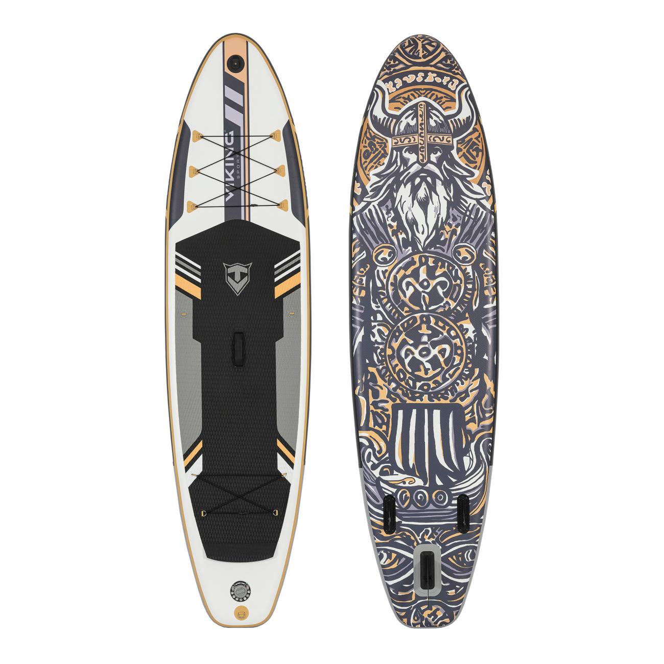 Paddleboard spojuje moderní design s výraznou vikingskou symbolikou v elegantní kombinaci bílé, černé a zlaté. Protiskluzová EVA podložka poskytuje pohodlí i stabilitu při jízdě. Spodní strana zaujme motivem vikingského válečníka a lodě, které podtrhují sílu a dobrodružný charakter paddleboardu. Tři ploutve pak zajišťují lepší stabilitu a snadnější ovládání na vodě.
