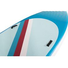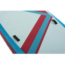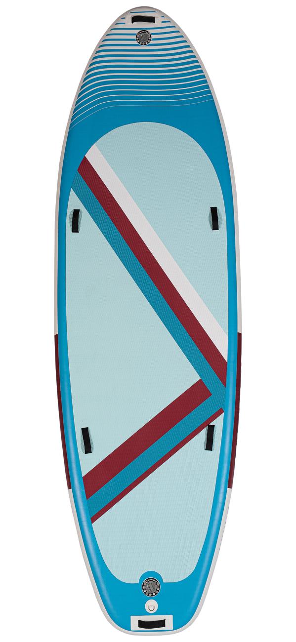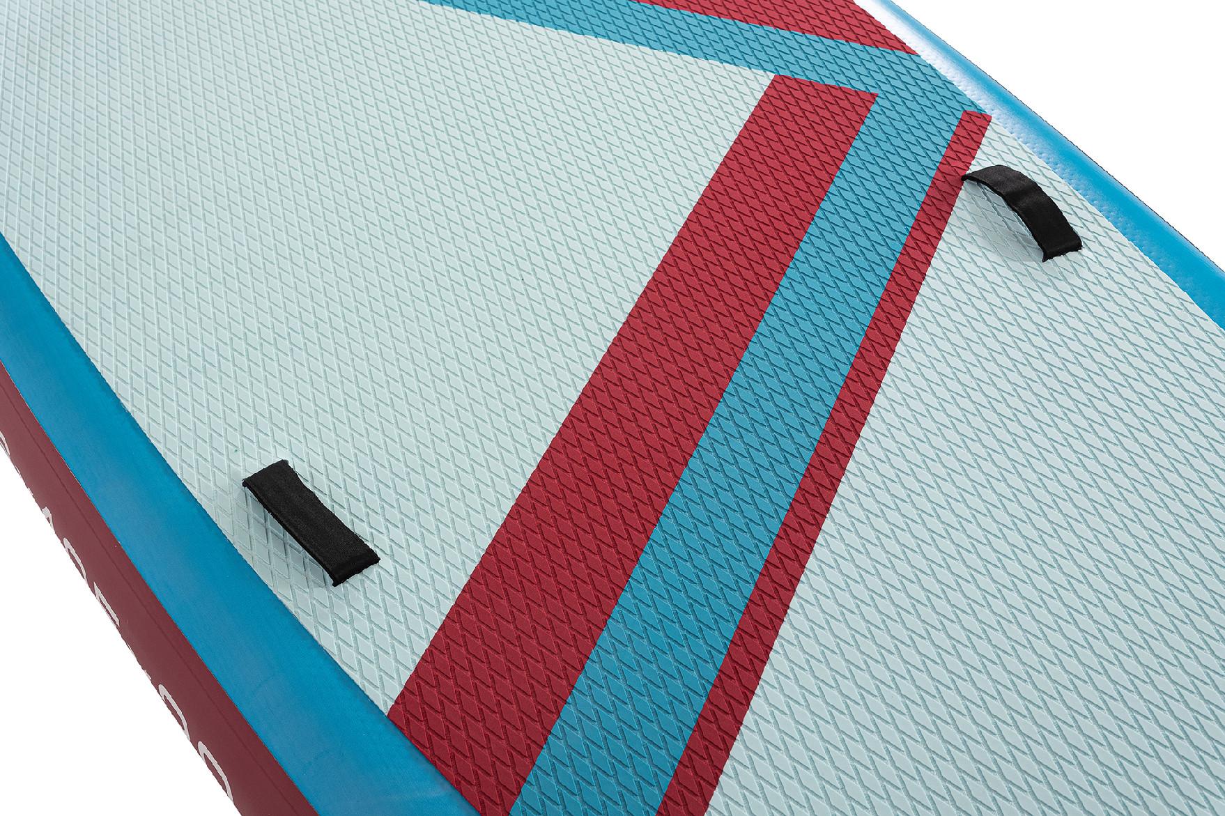 Tento velký paddleboard zaujme moderním a hravým designem v modré, bílé a červené. Protiskluzová EVA podložka zajišťuje pohodlný a stabilní postoj během jízdy. Spodní strana je elegantně jednoduchá a doplněná třemi ploutvemi, které zvyšují stabilitu a usnadňují ovládání na vodě.