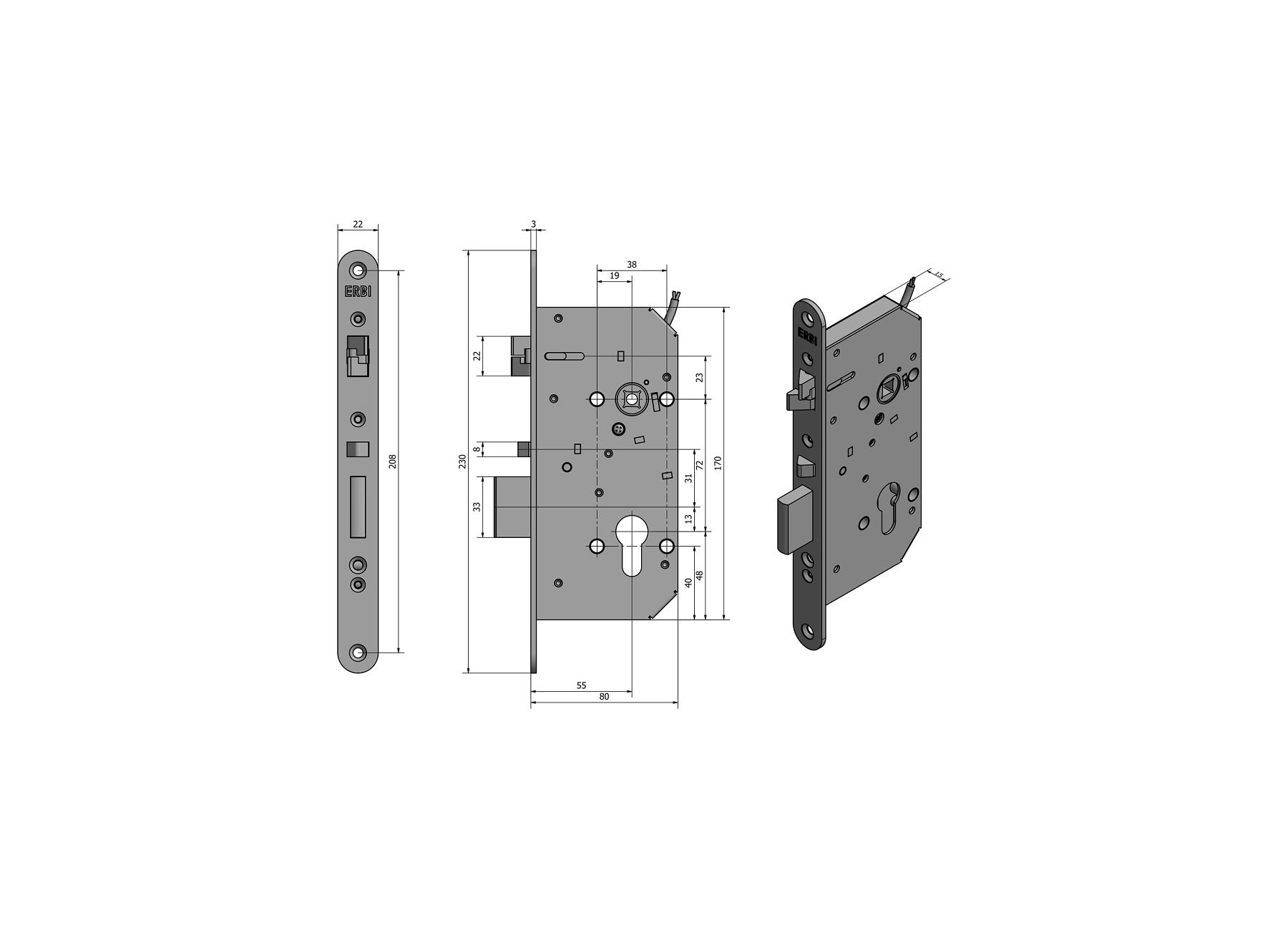 | Vlastnosti | vzdálenost kliky od čela zámku (včetně lišty) 55 mm |