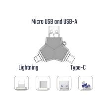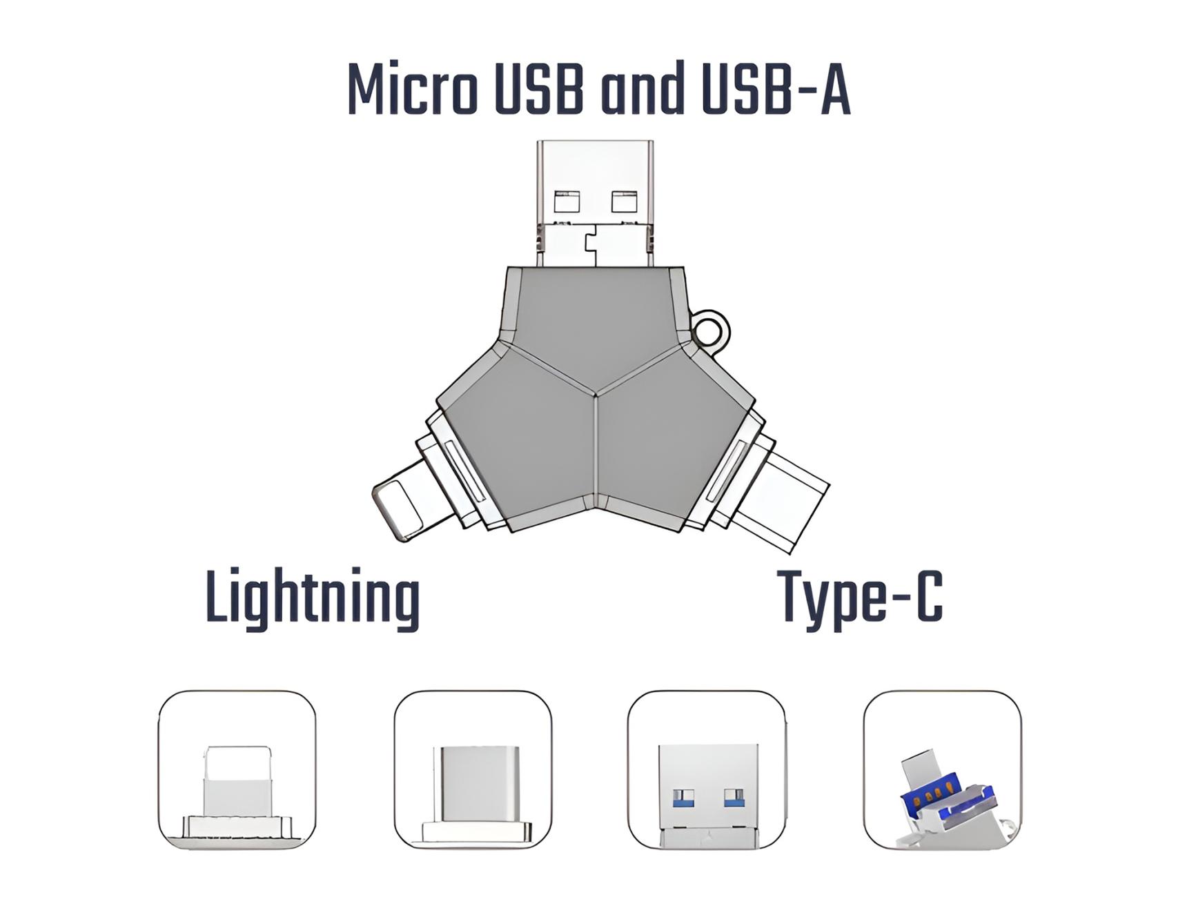 - USB flash disk se čtyřmi konektory USB 3.0, USB-C, Micro USB a Apple Lightning