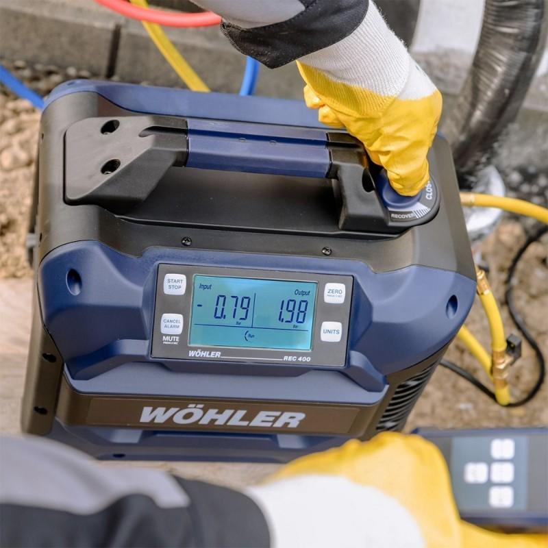 Zařízení Wöhler REC 400 Recovery je spolehlivým pomocníkem při odsávání chladiv třídy A1, A2 a A2L. K odsávání chladiva je navíc zapotřebí montážní pomůcka (např. Wöhler MR 400) a váha na chladivo (např. Wöhler RS 400).