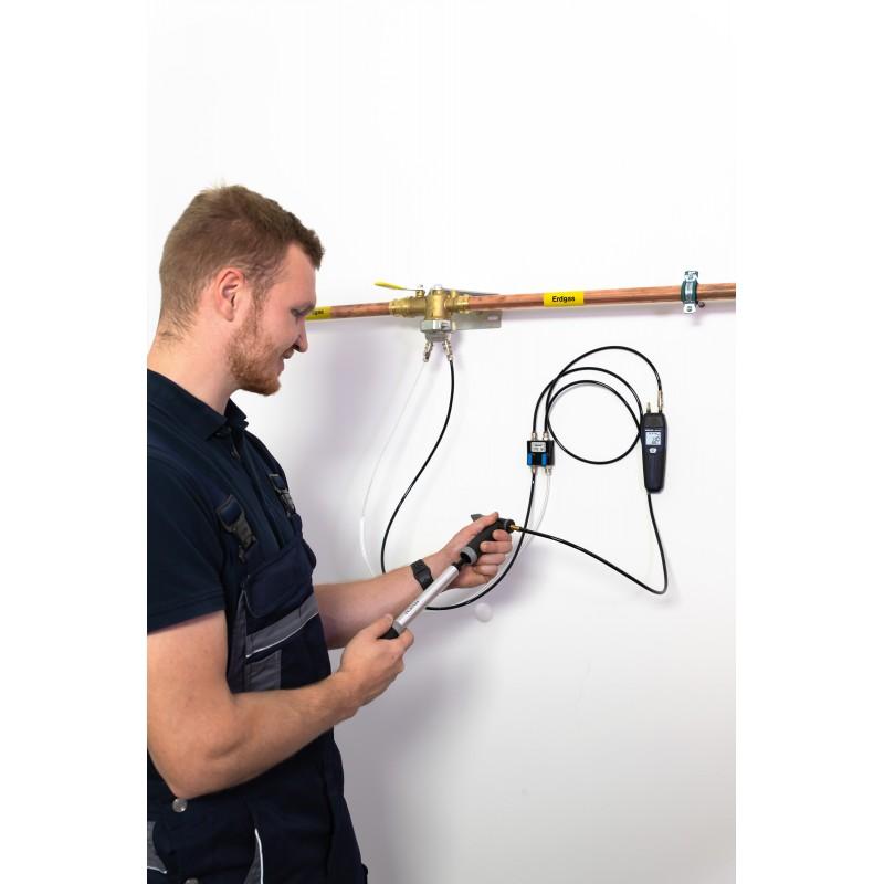 S příslušným připojovacím příslušenstvím se nově instalované plynové potrubí jednoduše natlakuje zkušebním tlakem pro zatěžovací zkoušku (1 bar).